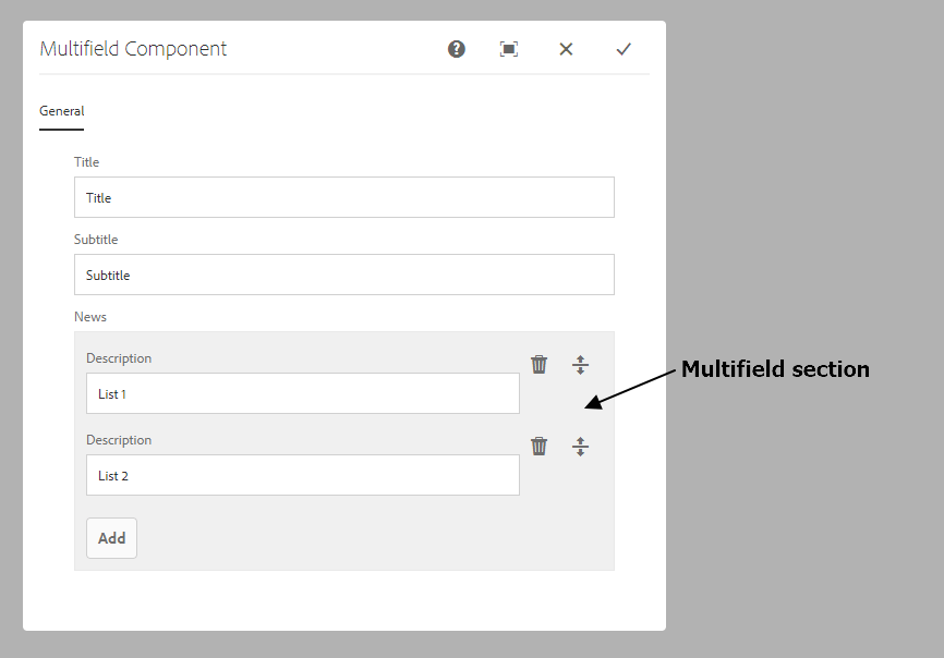 The multifield input is inside the “accordion” tag, the tags “title” and “subtitle” are used just to give a little bit more context.