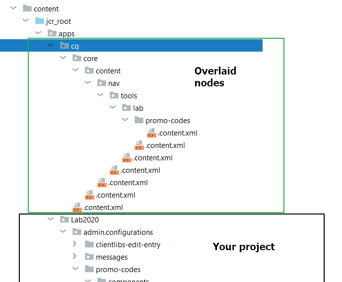 - Data are stored under the path “/conf/global/settings/lab2020/configurations/promo-codes”. There is the property “path” in the datasource tag and in the Java code as well. You can choose for sure another path. In this case, the path needs to be created via CRX.