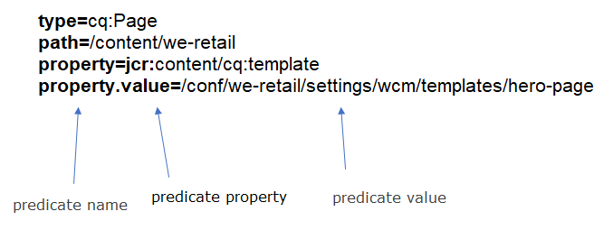 - type: to search a specific JCR node type, both primary node type or mixin type (e.g – cq:Page, dam:Asset)